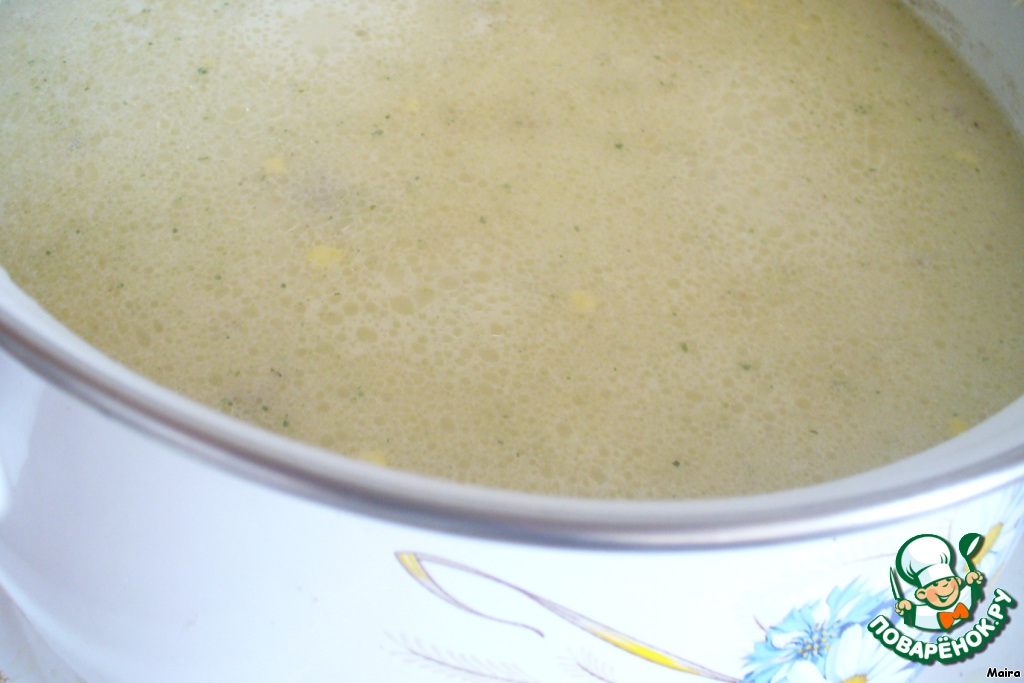 Бульон процедить. Гущу измельчить в блендере (или протереть через сито), добавить сливки и хорошо перемешать.