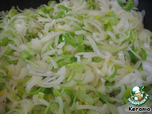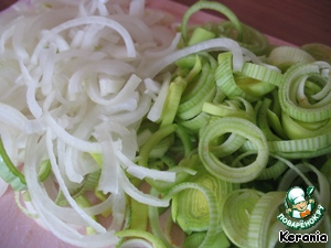 1. Лук очистить, лук-порей нарезать кольцами, лук репчатый – полукольцами.