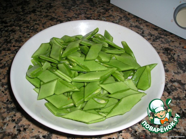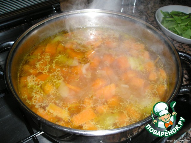 Поставить опять на медленный огонь,порезать стручки фасоли на небольшие кусочки 2-3см,формой напоминающие параллелограмм. Добавить в суп,дать закипеть,потом убавить огонь до минимума,добавить оставшееся оливковое масло и варить на медленном огне ещё в течении 10мин.