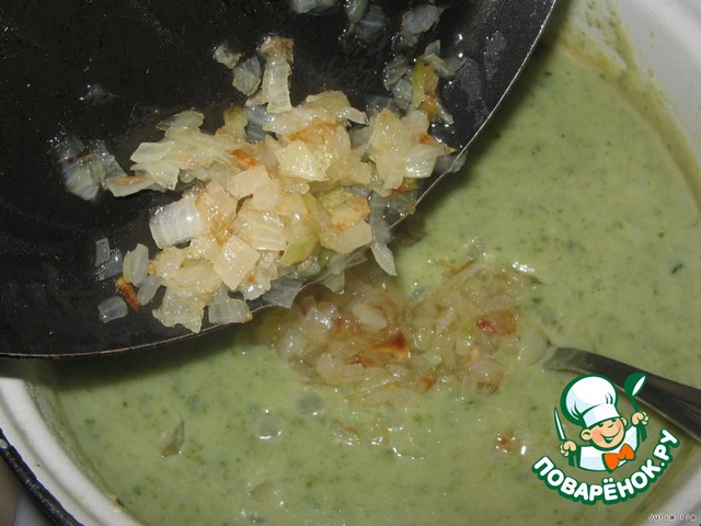 Добавляем обжаренный лук. Если хотите диетический супчик, то последние два шага пропускаем, а лук можно положить в сыром виде вместе с тыквой, сельдереем и цветной капустой.