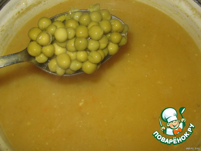 Добавить в готовый суп зелёный горошек (у меня консервированный, поэтому я добавляю его в самом конце).