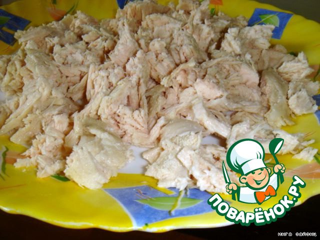 Добавить к луку и морковочке. Залить бульоном. Добавить курочку.