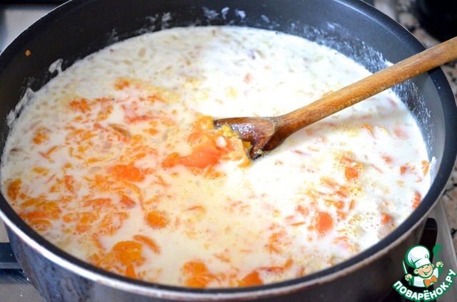 3. Достаньте тыкву из духовки и дайте ей остыть. Влейте молоко и бульон в сковороду к луку и доведите до кипения на среднем огне. Мякоть тыквы отделите от кожи, порежьте и добавьте к луку.