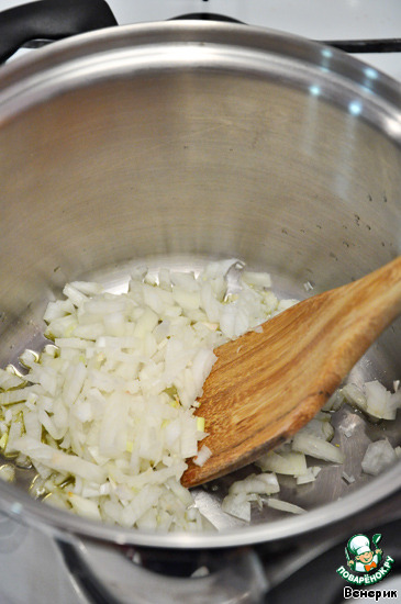 В кастрюле с толстым дном на оливковом масле слегка обжарить нарубленный репчатый лук и чеснок.