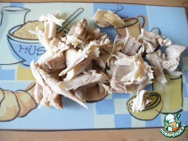Бульон процедить. Курицу остудить, мясо отделить от костей и нарезать небольшими кусочками.