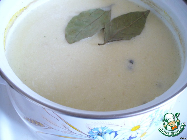 Полученное пюре ввести в бульон, посолить, добавить лавровый лист и перец горошком, довести до кипения и проварить еще 5 минут. Готовый суп подавать с гренками.