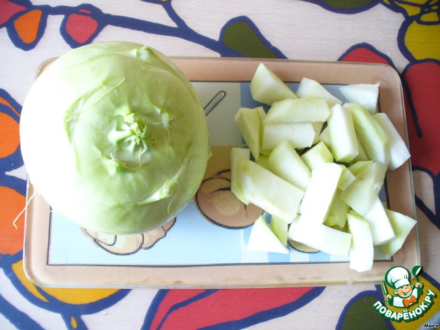 Кольраби нарезать брусочками. Так же нарезать картофель. Овощи положить в бульон и варить до готовности 20-25 минут.