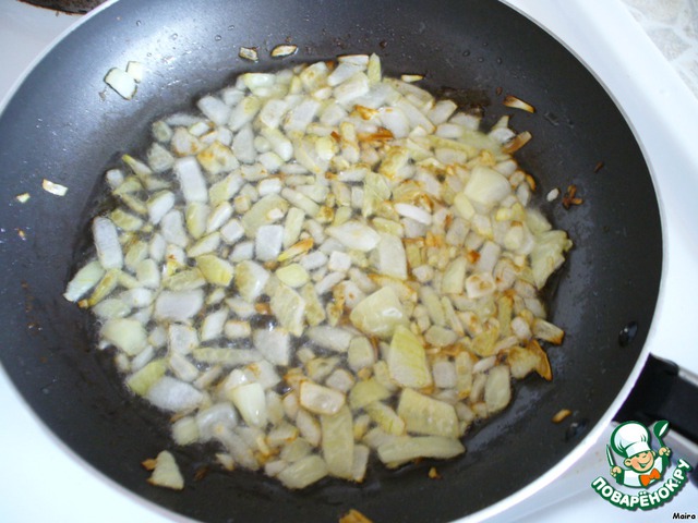 Лук мелко нашинковать, обжарить на растительном масле до золотистого цвета.