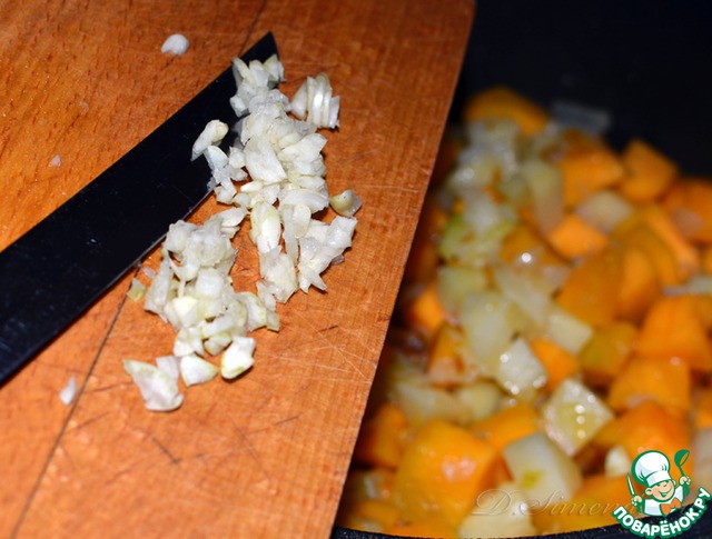 1 луковицу и чеснок мелко нарезать, тыкву и картофель нарезать кубиками. Я готовила суп в глубоком казане, там же и обжаривала овощи. Нечего пережаривать не будем, раз мы говорим о полезном питании, обжариваем по чуть-чуть до прозрачности.