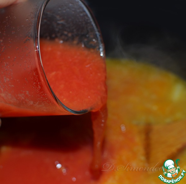 Перед самым выключением вливаем томатный сок, обязательно томатный сок должен быть домашним, магазинным вы рискуете испортить свой суп. Суп прогреваем, не даем ему кипеть.
