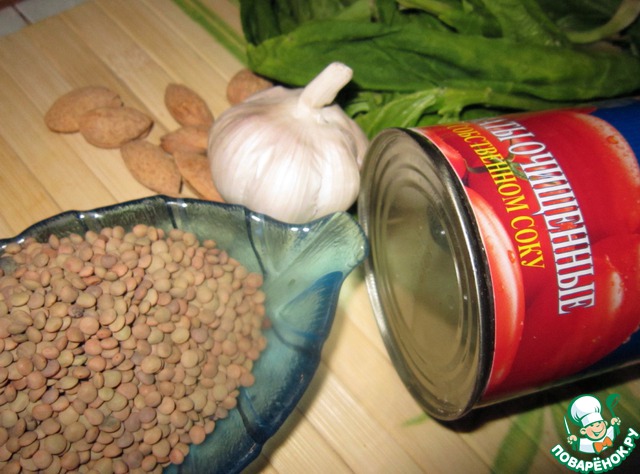 Шпинат вымыть и обсушить. Миндаль поджарить и нарезать на пластинки. Вымытую чечевицу залить бульоном. Добавить туда томаты, лук, чеснок, специи, перемешать, поставить на огонь. Довести до кипения на большом огне, посолить, убавить огонь, накрыть крышкой и варить 25 минут. Измельчить блендером до пюреобразного состояния.