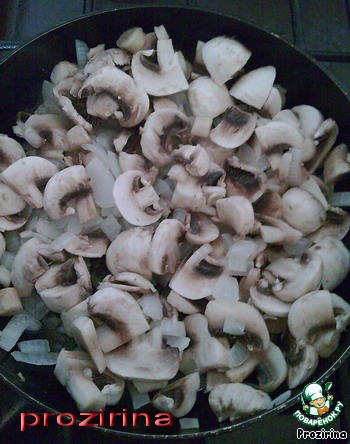 Шампиньоны обжарить с мелко нарезанным репчатым луком, хорошо посолить.