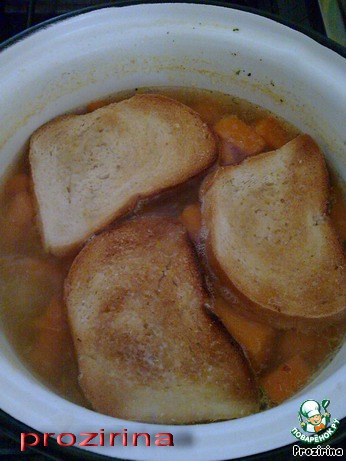 Готовые тосты положить в кастрюлю, чтобы они слегка намокли и отдали запах чеснока супу.