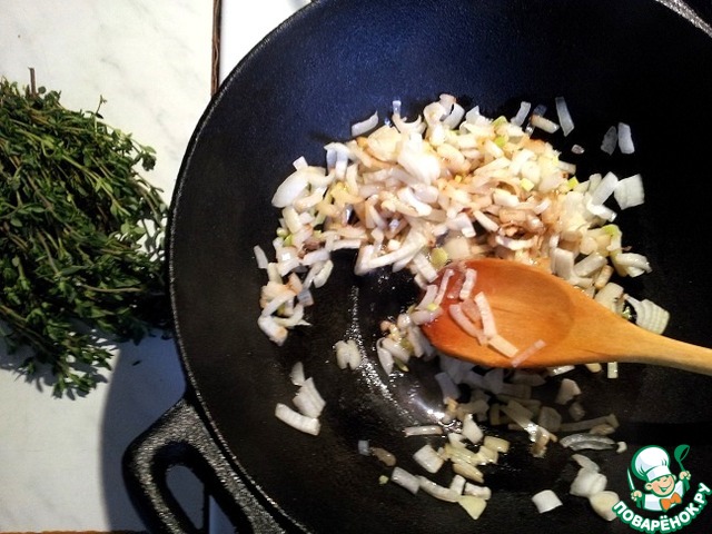 Лук очистить и мелко нарезать. На среднем огоне разогреть сковороду с оливковым маслом и пассеровать лук, пока он не станет мягким.
