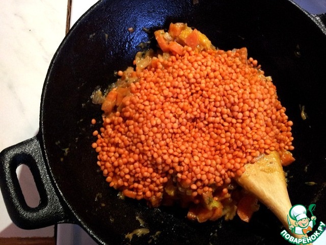 Через 15 минут в тушенным овощам добавляем чечевицу, чеснок и вливаем горячую воду. Доводим воду до кипения и уменьшаем огонь до минимума, готовим в течении 20-25 минут.