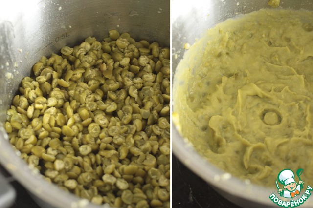 ***Горох нужно промыть, сварить из соотношения 1:2 до мягкости около 30 минут. В нашем случае зеленый и желтый горох варим в отдельных кастрюлях. При помощи блендера сделаем из гороха пюре, я люблю вариант, при котором остаются частички гороха.