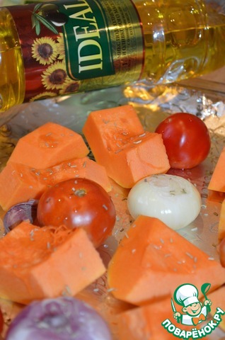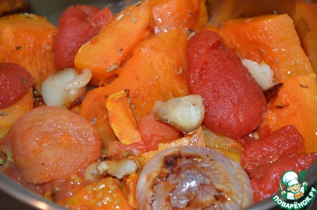 Тыкву очистить и удалить семена. Нарезать на крупные куски. Лук очистить от кожуры. Противень застелить фольгой, выложить на него тыкву, лук, зубчики чеснока в шелухе и целые помидоры. Сбрызнуть маслом и посыпаь розмарином. Поставить в разогретую до 220 С духовку на 35 минут. В середине запекания перевернуть.
