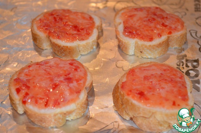Чеснок и чили измельчить ножом, затем переожить в ступку, добавить щепотку соли и хорошо растереть. Смесь переложить в миску, добавить желток, уксус и взбить венчиком. продолжая взбивать потихоньку добавлять масло. Получившимся соусом смазать кусочки багета и запекать 5 минут в духовке. Готовые крутоны посыпать натертым сыром.