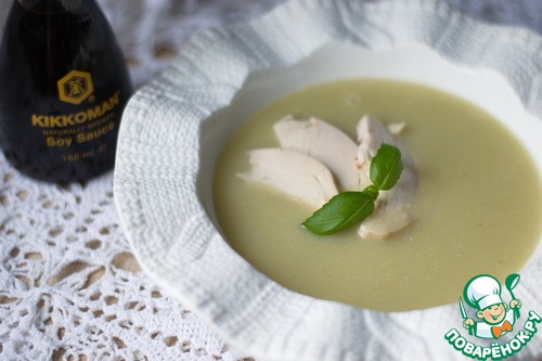 | Сегодня готовим нежный суп-пюре с курицей, рисом, горохом и соевым соусом. |