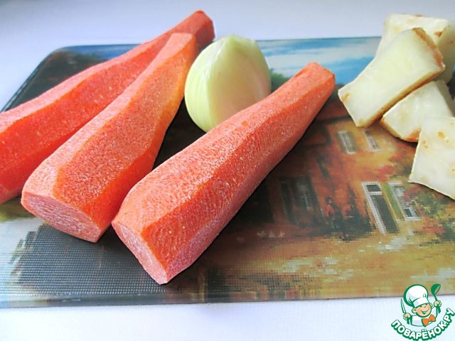 Морковь и сельдерей очищаем, режем небольшими кусочками. Я использовала замороженную заготовку сельдерея. Режем лук средними ломтиками.