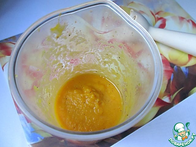 Ждем, пока суп немного остынет, вливаем апельсиновый сок и пюрируем его блендером. Разливаем суп по бокалам или стаканам, не доходя около 1 см до края.