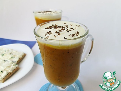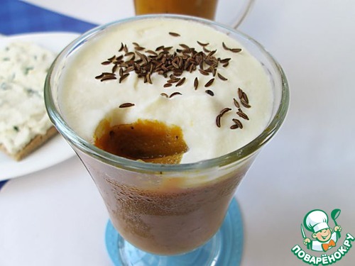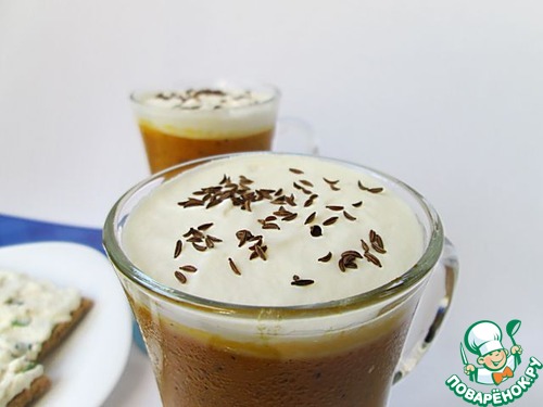 Щепотку зерен тмина обжариваем на сухой раскаленной сковороде полминуты, встряхивая ее время от времени, охлаждаем. Взбиваем сливки в пышную пену и распределяем по бокалам, посыпаем сверху обжаренными зернами тмина. Советую к сливкам при взбивании добавить щепотку сахарной пудры и ванилина. На первый взгляд сочетание кажется странным, но на самом деле очень вкусно! Перед подачей я охладила суп в холодильнике, вместе с хлебцами с творожной намазкой получился здоровый и легкий летний перекус.