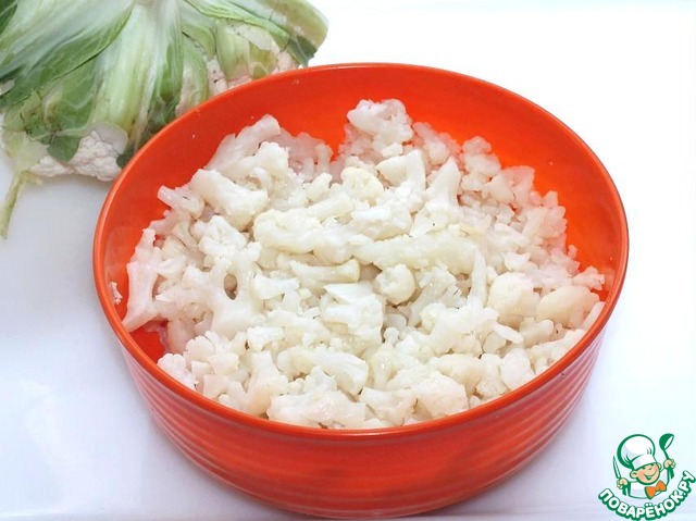 Цветную капусту режем на небольшие кусочки, можно и побольше, чем на фото у меня помощники перестарались.