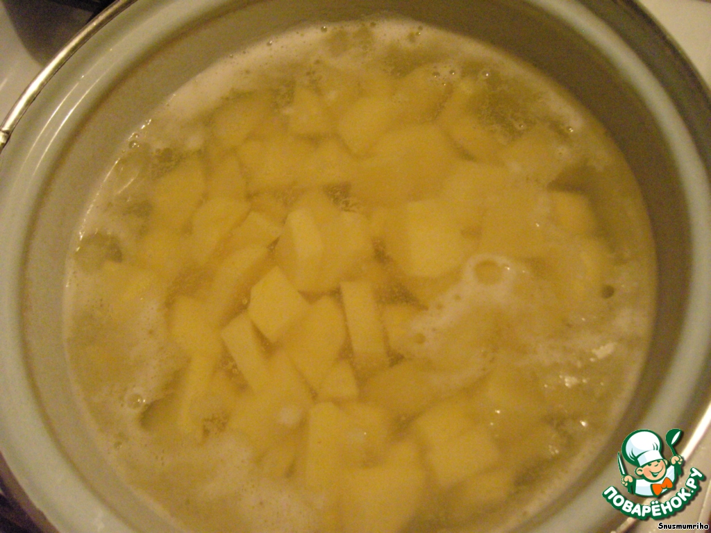 Картошечку режем, вода должна покрывать картошку на сантиметр, варим до готовности (20 минут). Затем картофеледавилкой делаем пюре, воду не сливаем.