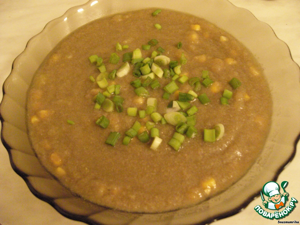 Тушеные грибы и лук в блендере перемалываем до однородной массы. Добавляем в супчик. Туда же добавляем кукурузу. Варим еще минут 5-7.