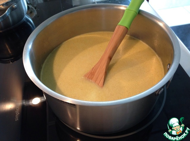 Добавить бульон, сливки, карри, куркуму и еще раз перемешать в блендере. Поставить на огонь, довести до легкого закипания.