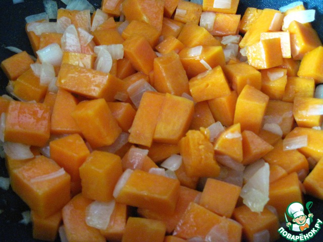 Добавить тыкву и обжарить на сильном огне в течение 5 минут.