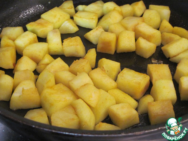 Яблоки очистить, нарезать на кубики, выложить в сковороду с маслом.