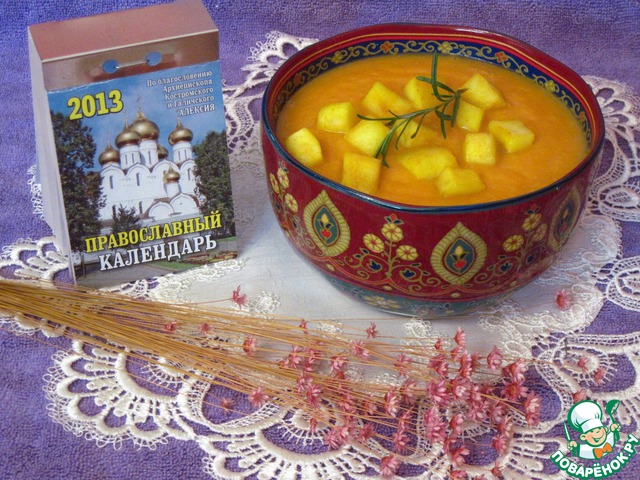 | Вкусный постный суп. Сытный благодаря тыкве и картофелю, обогащенный растительными белками, которые легко усваиваются организмом. Яблоки добавили блюду приятную кислинку. Это суп разнообразит Ваше меню в пост. |