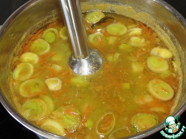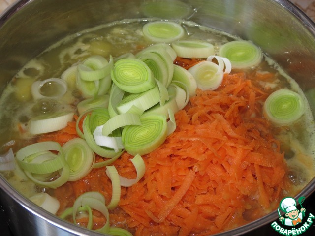 Морковь и лук - порей добавить в суп за 5 минут до готовности. Посолить и поперчить, добавить мяту и гвоздику.