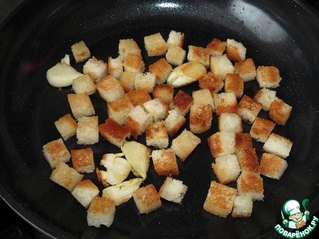 Белый хлеб порезать на маленькие кубики и обжарить на чесночном масле.