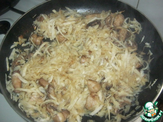 Пока запекаем овощи, натереть корень сельдерея, нарезать грибы и потушить их минут5 на сковороде