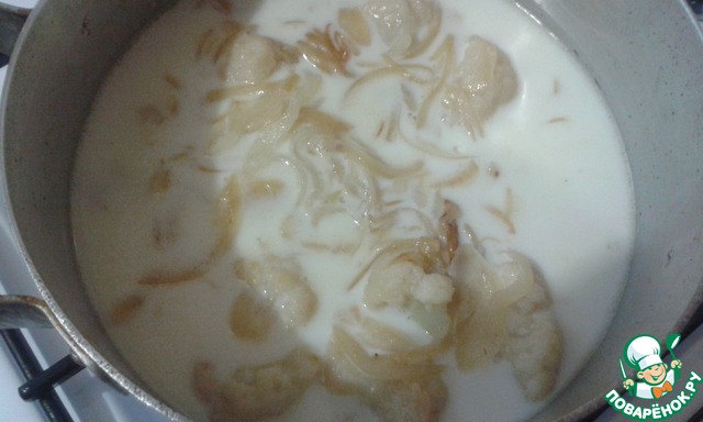 В кастрюлю наливаем молоко, доводим до кипения и добавляем в него обжаренную цветную капусту с луком. Провариваем все вместе до размягчения цветной капусты.