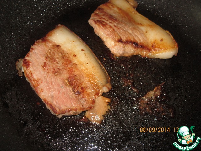 Корейку хорошо карамелизовать (обжарить) в кастрюле со всех сторон, слить лишний жир и залить горячим бульоном или водой.