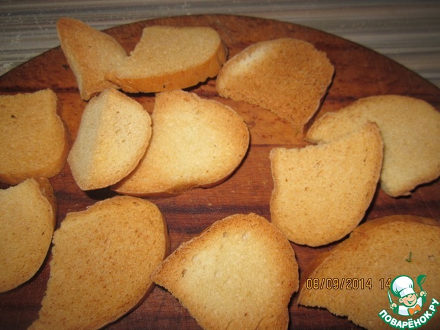 В это время порезать багет и очень хорошо подрумянить в духовке.