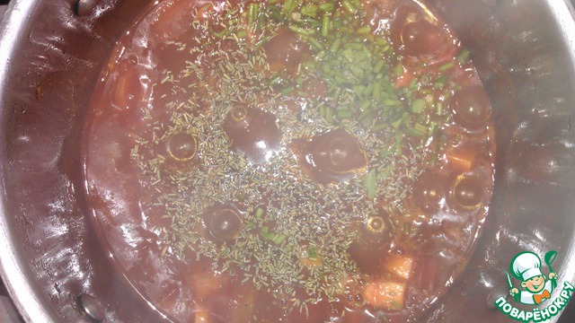 Добавляем помидоры, зелень и 1 ч. л. розмарина в суп.