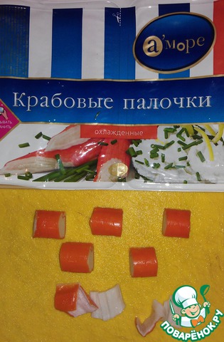 Крабовые палочки режем на брусочки по 1 см. и раскручиваем) спиральки можно поделить на несколько частей), на 1 порцию я кладу 2 крабовых палочки