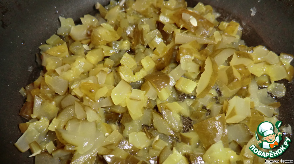 Тем временем огурцы режем мелкими кубиками и отдельно обжариваем на сковородке с растительным маслом, и тушим, добавив немного воды.