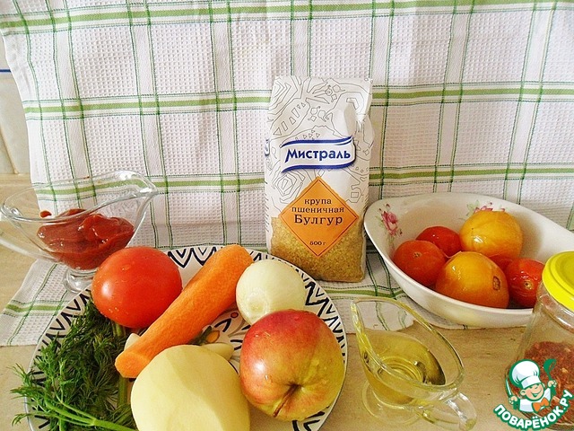 В кастрюлю к нашим овощам добавляем потушенные маринованные Помидорки, булгур и специи. Солим по вкусу, заправляем томатной пастой и зеленью, варим 15 минут (до готовности).
