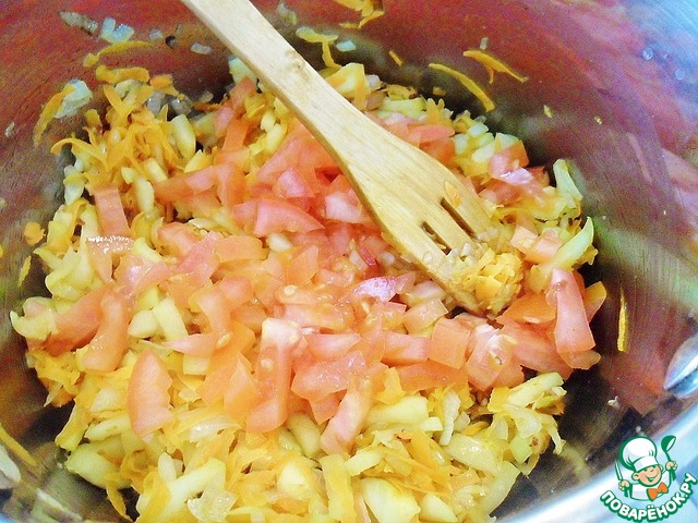 Еще немного обжарить и добавить нарезанный помидорчик. Слегка притомить и влить 1,5 л воды.