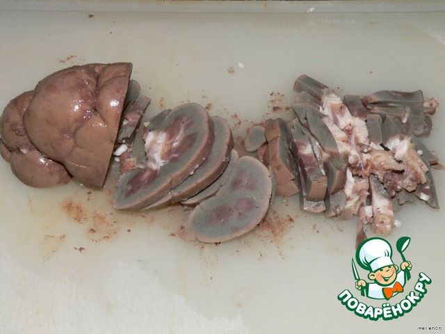 Почки покрошить соломкой и добавить к обжаренным луку и морковке, продолжать обжаривать на небольшом огне под крышкой.