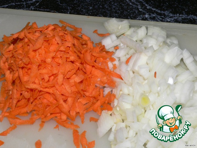 Лук нарезать кубиками, морковь натереть на крупной терке и обжарить на подсолнечном масле.
