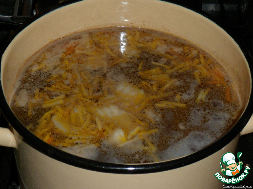 Довести до кипения, добавить зажарку и варить суп на маленьком огне.
