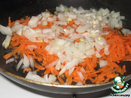 Морковь трем на терке, лук мелко режем, слегка обжариваем на растительном масле и отправляем в суп. Рис хорошо моем и тоже кладем в суп.