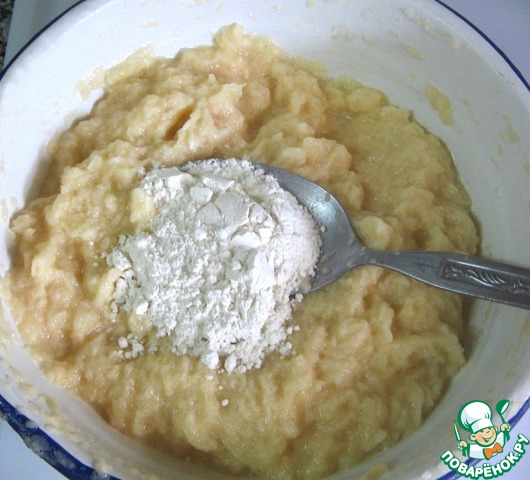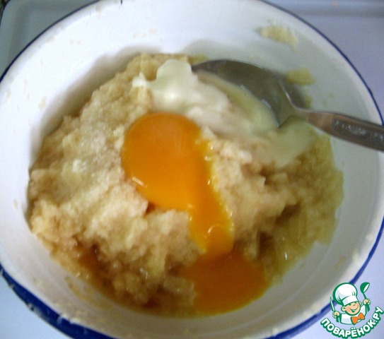 В картофель добавляем яйцо, соль и крахмал, перемешиваем.