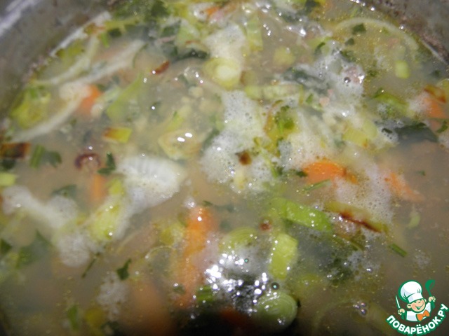 Через 10 минут в бульон с печенью добавить обжаренные овощи и посолить. Варить еще 20 минут